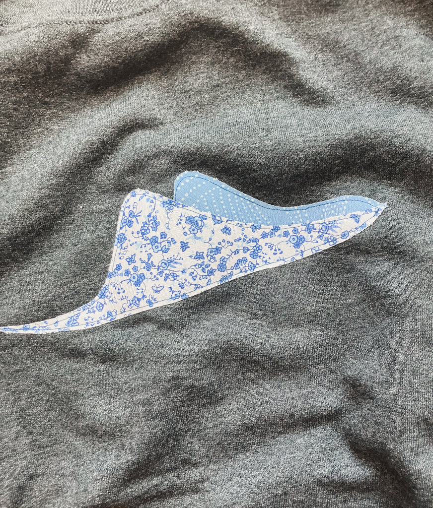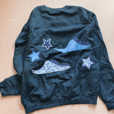 One of a kind! Gorgeous dark grey pullover with sting ray and star appliqués. All designed, drawn, cut and sewn by Brynlee!